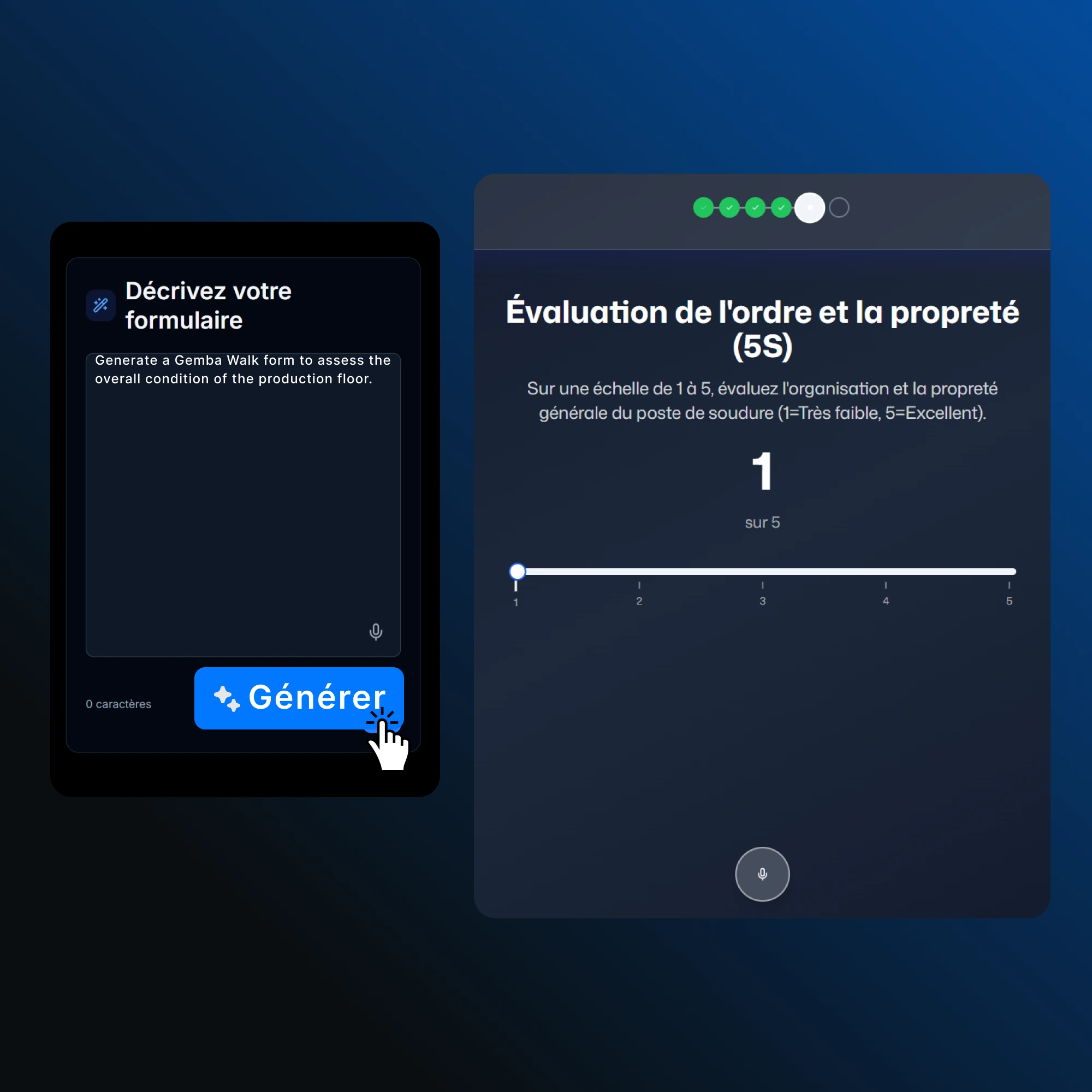 Décrivez votre besoin, l’IA génère vos formulaires (Gemba Walks, rapports d’inspection, contrôles qualité…). Standardisez vos opérations, réduisez le temps de création et obtenez des données fiables pour accélérer la prise de décision.