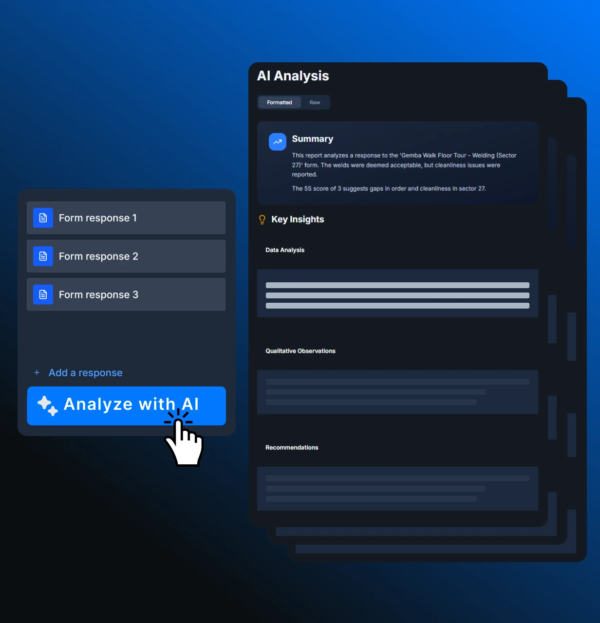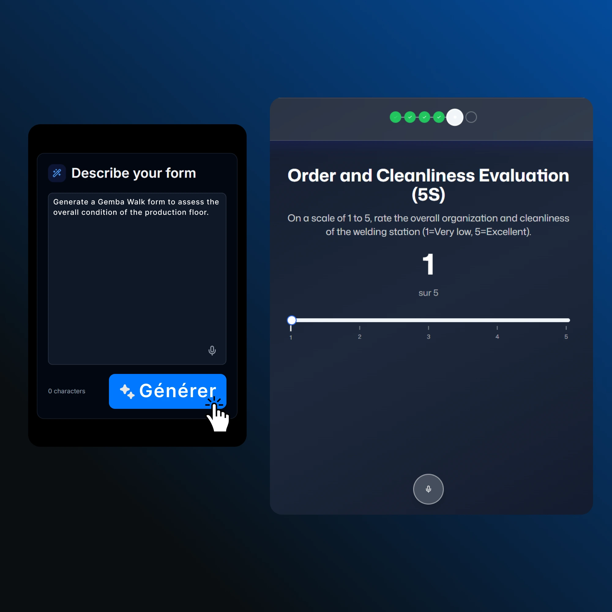 Describe what you need — the AI instantly generates your forms (Gemba Walks, inspection reports, quality control checklists…). Standardize processes, cut form-creation time, and capture reliable data to accelerate decision-making.