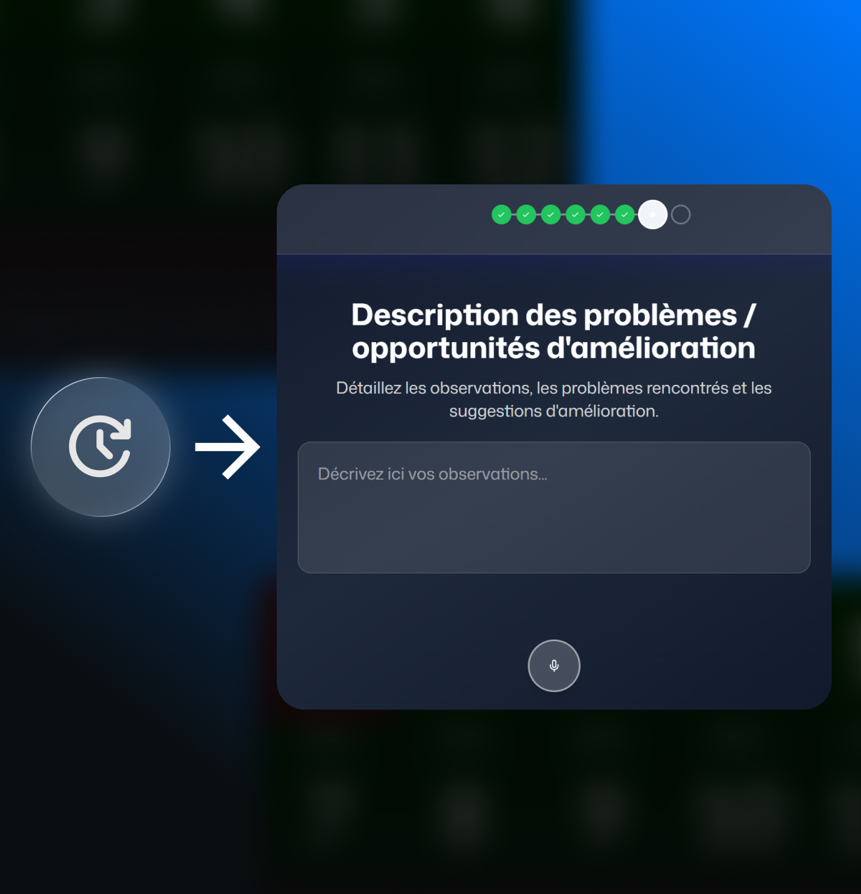 Simplifiez la saisie pour tous vos opérateurs, même sans compétences numériques. Répondez à la voix ou avec de grands boutons visuels sur tablette, réduisant les erreurs et rendant la collecte de données rapide et agréable.